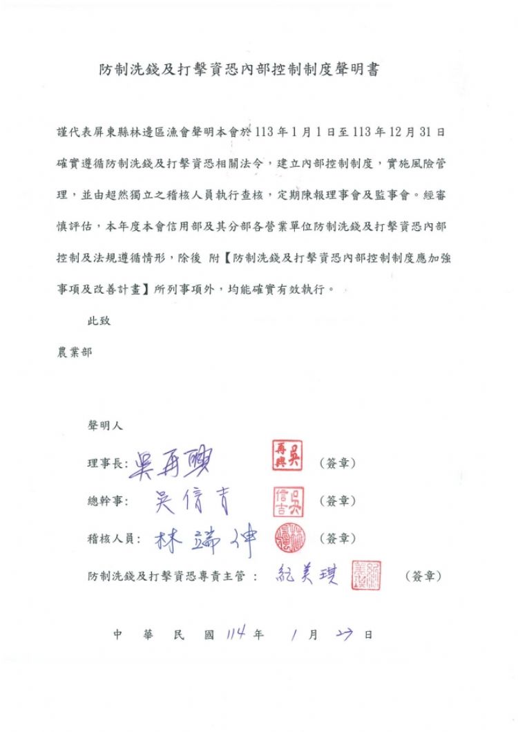 113年防制洗錢及打擊資恐內部控制制度聲明書